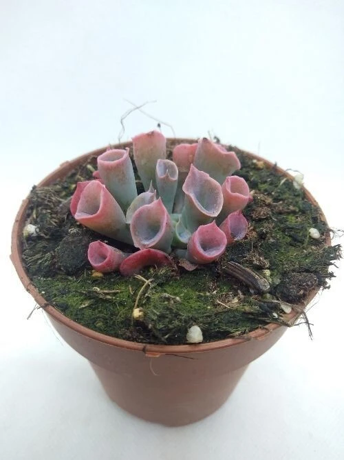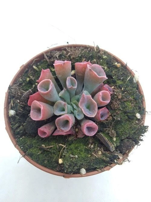 Cuidados de la planta:Les gusta estar le gusta estar en el exterior, preferible al sol pero evitando las horas centrales del día ya que se quemará y mostrará manchas negras, si por el contrario empieza a enverdecerse le falta luz. Temperatura ideal entre 18 y 25ºC.Soporta las heladas ligeras por un periodo corto de tiempo ( si baja de 3ºC mejor proteger o meter en interior). Como todas las suculentas es muy sensibe al exceso de riego, requieren dejar secar bien entre riegos y que la tierra no esté húmeda(riego moderado entre primavera y en verano, siendo semanal si más calor y luego disminuir cada diez días en otoño y 20 /25 días en invierno).Se multiplica por semillas o separación de hijuelos y produce flores de color rosa pálido en el centro con pistilos rojos, pueden llegar a medir entre 20 y 35 mm de largo.